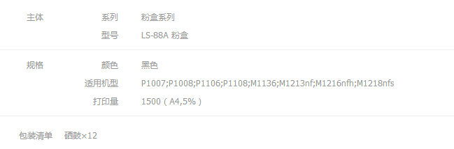 颜色黑色 适用机型P1007;P1008;P1106;P1108;M1136;M1213nf;M1216nfh; M1218nfs 打印量1500(A4,5%)