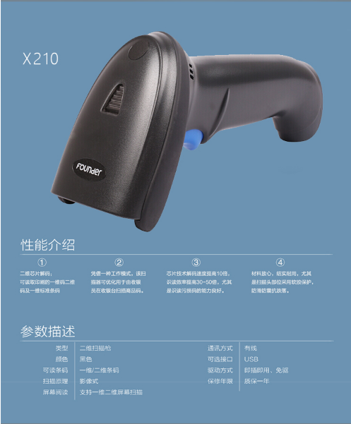 传感像素:640*480(像素);光源:瞄准 617nm LED、照明; 6500K LED;视场角;45°(水平方向)x35°(垂直方向);旋转/倾斜/偏转:360°/±65°/±60°;电池容量:无;充电时间:USB直充;无线技术:无;操作距离:100米(开放区域)打印对比度:25%(最小反射差);接口支持:USB RS232;移动容差:每秒最高25英寸(63.5厘米)